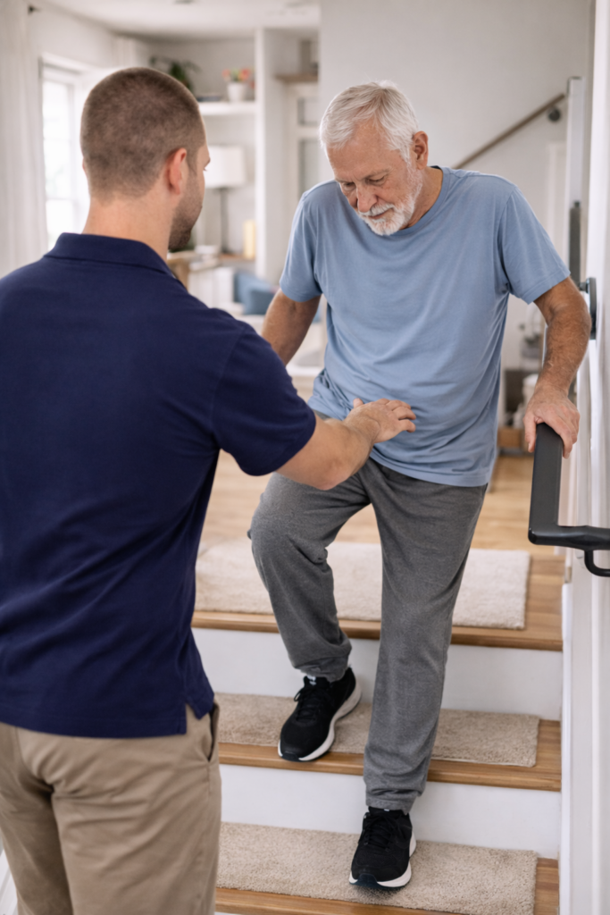 Neurophysiotherapeutischer Ansatz für Patienten mit Schlaganfall, Parkinson, MS und anderen neurologischen Erkrankungen. Die Behandlung orientiert sich an alltagsrelevanten Bewegungen, fördert Stabilität, Koordination und funktionelle Selbstständigkeit. Durch die Durchführung bei Ihnen zu Hause lassen sich Bewegungsabläufe direkt in die gewohnte Umgebung übertragen – ein entscheidender Vorteil der mobilen Physiotherapie in Ulm, Neu-Ulm und Umgebung.